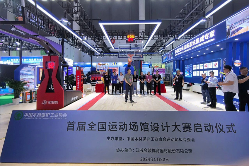 展會期間由中國木材保護工業(yè)協(xié)會運動地板專委會主辦的首屆全國運動場館設(shè)計大賽啟動儀式在金陵體育展位舉行,金陵體育總經(jīng)理李劍剛出席并致詞。